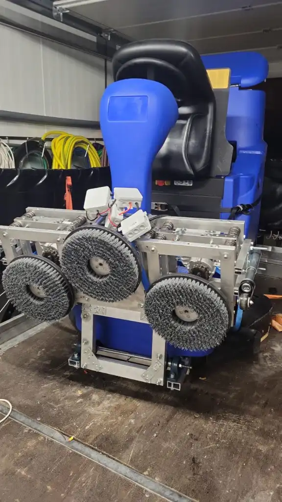 Genau aus diesem Grund haben wir unsere eigenen, einzigartigen Scheuersaugmaschinen entwickelt. Diese sind speziell darauf ausgelegt, selbst die gröbsten Tiefgaragenböden mühelos zu bewältigen. Doch das ist noch nicht alles: Ein besonderes Merkmal unserer Konstruktion ist das frontal montierte Scheuerdeck.